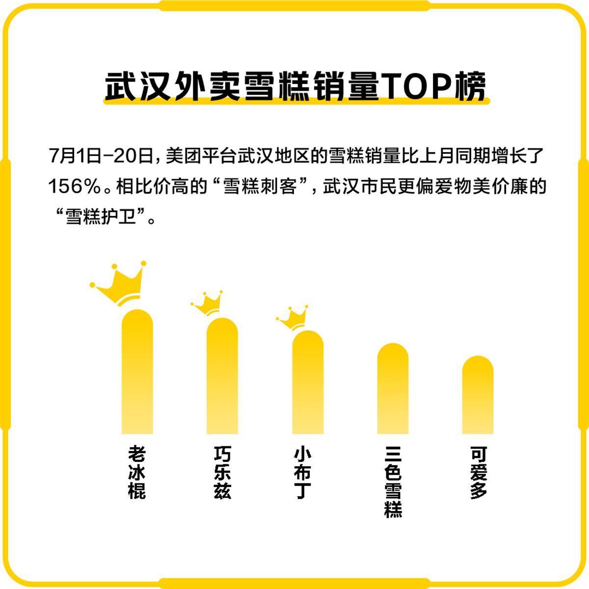 其中,雪糕销量比上月同期增长了156%,增速位列全国第六。相比价高的“雪糕刺客”,武汉市民更偏爱物美价廉的“雪糕护卫”,销量前五的雪糕分别为:老冰棍、巧乐兹、小布丁、三色雪糕、可爱多。