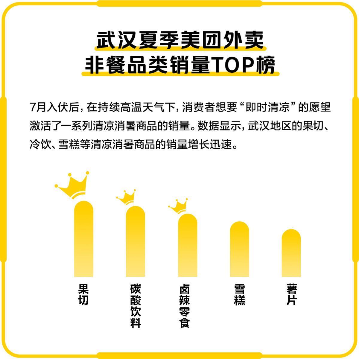 7月入伏后,在持续高温天气下,消费者想要“即时清凉”的愿望激活了一系列清凉消暑商品的销量。随着超市百货消费券的发放,果切、冷饮、雪糕、啤酒等清凉消暑商品的销量增长迅速。美团外卖数据显示,7月以来,武汉地区美团外卖非餐品类商品销量TOP5的品类分别是果切、碳酸饮料、卤辣零食、雪糕、薯片。
