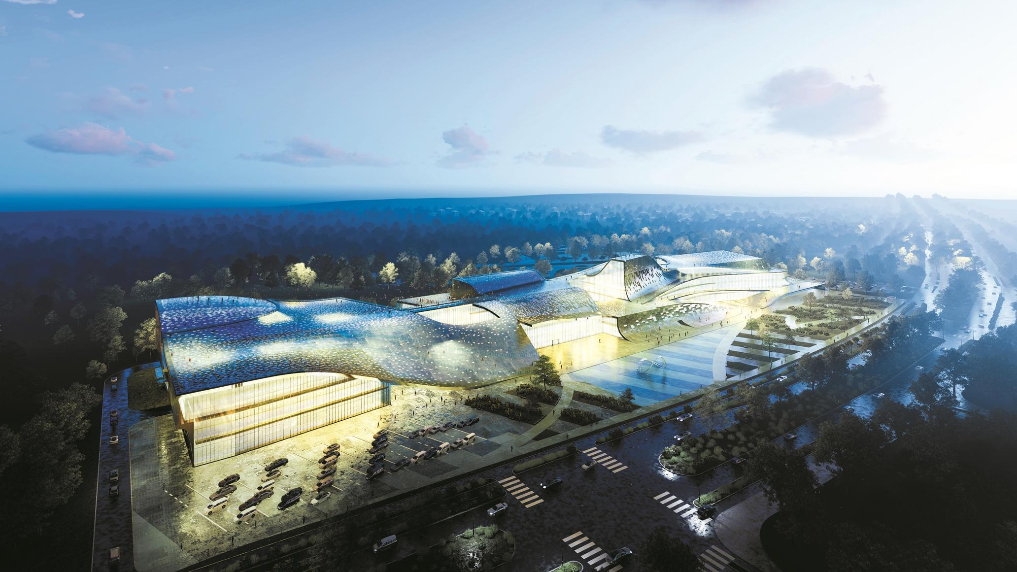 打开项目效果图,第一感觉就是“惊艳”:文体中心结构独特、造型新颖:工程主体采用钢筋混凝土框架结构,立面为全玻璃幕墙,整个建筑形似宇宙飞船造型。建筑外观色系为青铜色系,灵感来源于青铜编钟,极具历史底蕴。屋面采用种植屋面,与附近高罗河湿地公园完美融为一体。