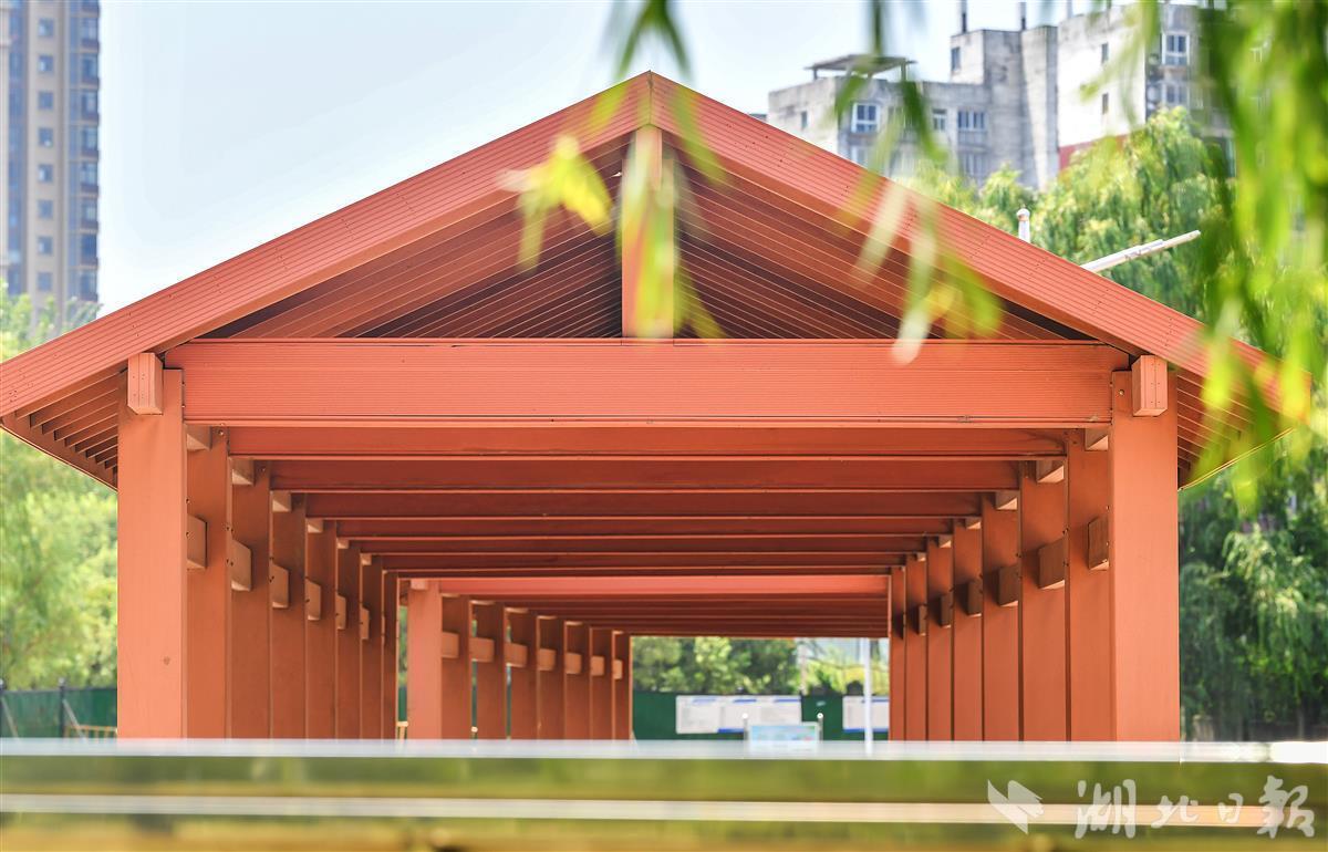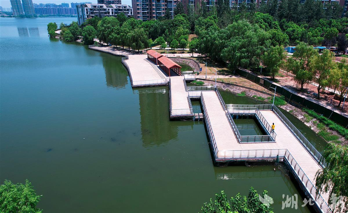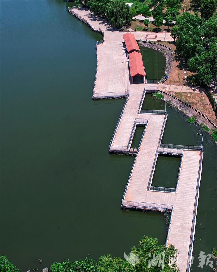 7月27日,改造升级后的武汉市新洲区阳逻柴泊湖休闲娱乐广场水上栈道鸟瞰,水上栈道和栈道上的凉亭经翻新后再现往日靓丽的风景。