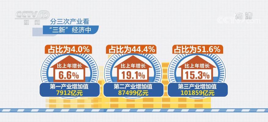 分三次产业看,“三新”经济中,第一产业增加值为7912亿元,比上年增长6.6%,占比为4.0%。第二产业增加值为87499亿元,比上年增长19.1%,占比为44.4%。第三产业增加值为101859亿元,比上年增长15.3%,占比为51.6%。