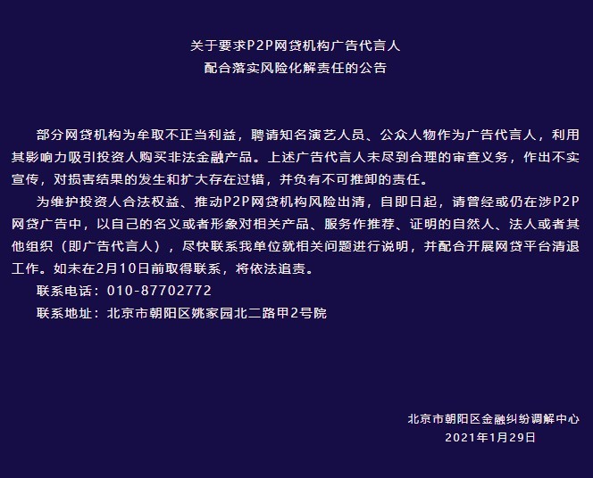 北京市朝阳区金融纠纷调解中心发布《关于要求P2P网贷机构广告代言人配合落实风险化解责任的公告》。
