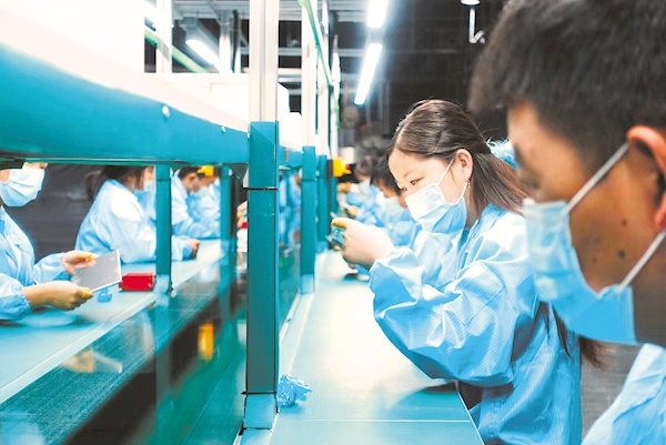闻泰科技智能终端产业园生产线上,质检员正在检视平板电脑外壳表面处理情况。