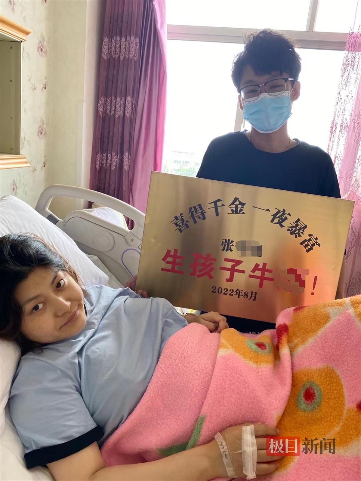 视频显示,一女子躺在病床上,右手还贴着胶带。床边一男子举着一块金属牌子,上面写着:“喜得千金一夜暴富,生孩子牛!”牌子落款为2022年8月。两人一同看向镜头,该子女露出开心又无奈的表情。