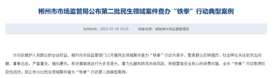 中国经济网北京8月2日讯 近日,郴州市市场监管局公布第二批民生领域案件查办“铁拳”行动典型案例。