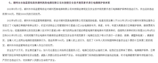 其中,郴州市市场监管局查处郴州西奥电梯有限公司未按照安全技术规范要求进行电梯维护保养案显示,2022年5月17日,郴州市市场监管局依法对郴州西奥电梯有限公司未按照法律规定及安全技术规范要求进行电梯维护保养的违法行为,作出没收违法所得7000元、罚款30000元的行政处罚。