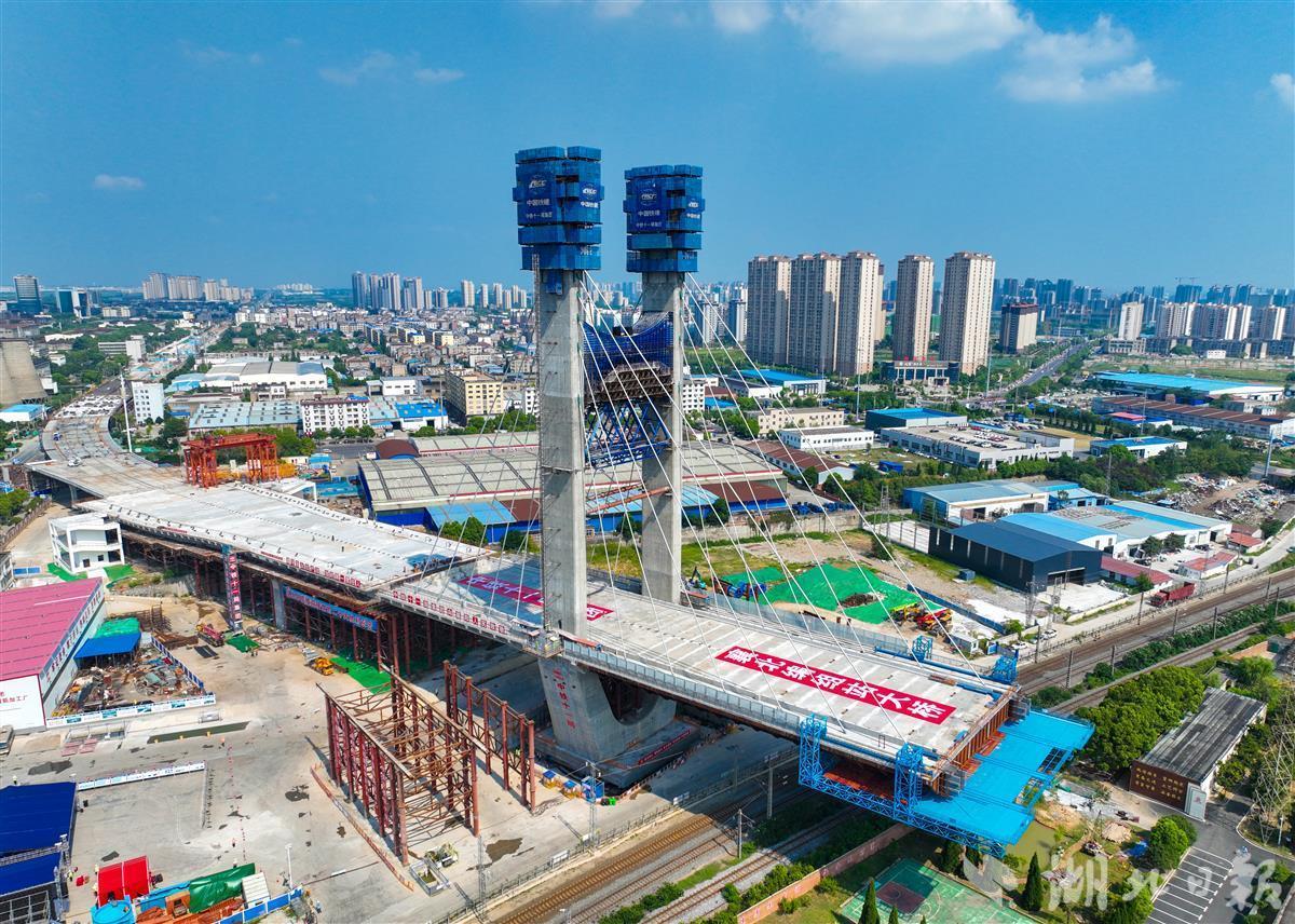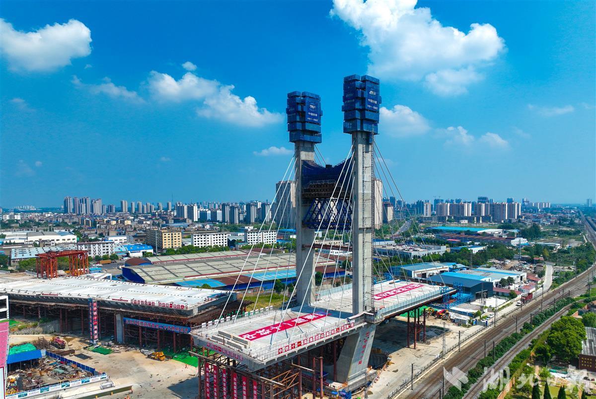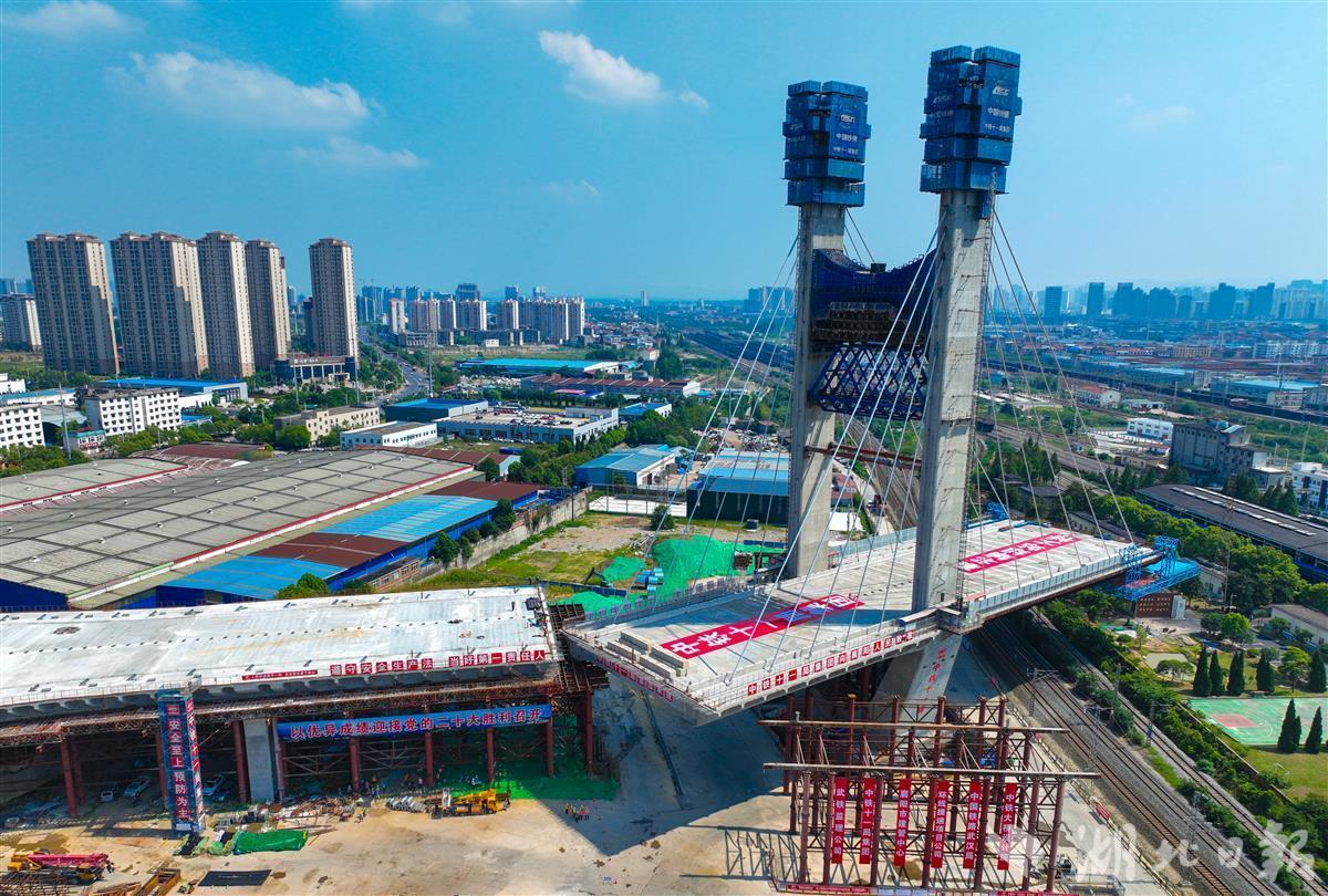 襄阳北编组站大桥为双独塔双索面混合梁斜拉桥,位于湖北襄阳境内,主桥长920米,宽37.5米,跨越32股铁路线。为确保铁路在项目施工期间正常运营,最大限度减少对周边环境的影响,襄阳北编组站大桥主梁采取部分转体+部分悬拼施工的施工方法,即先在平行于汉丹、焦柳铁路方向进行钢-混组合梁支架拼装施工,再利用铁路运行“天窗点”进行转体对接。