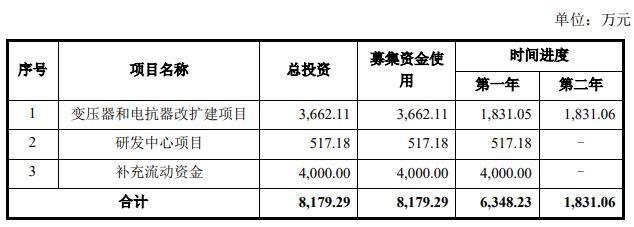 亿能电力拟募集资金8,179.29万元,分别用于变压器和电抗器改扩建项目、研发中心项目、补充流动资金。