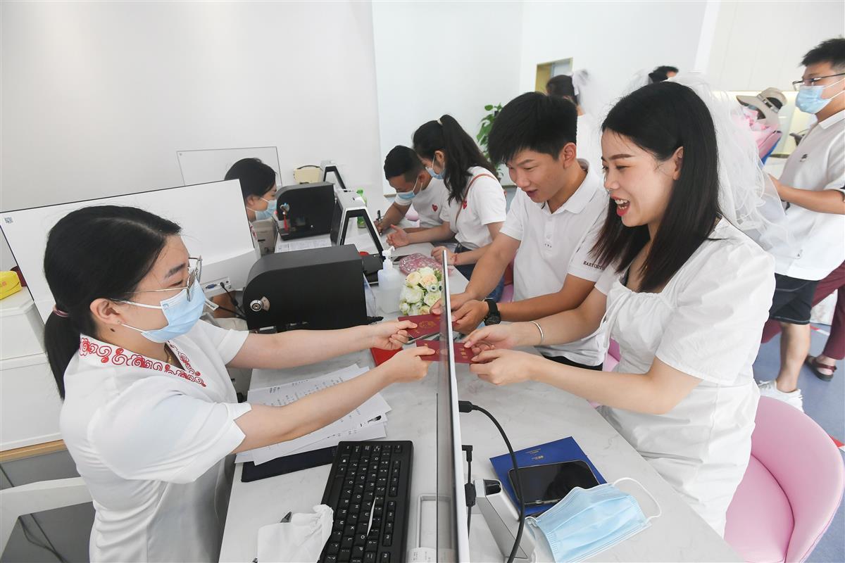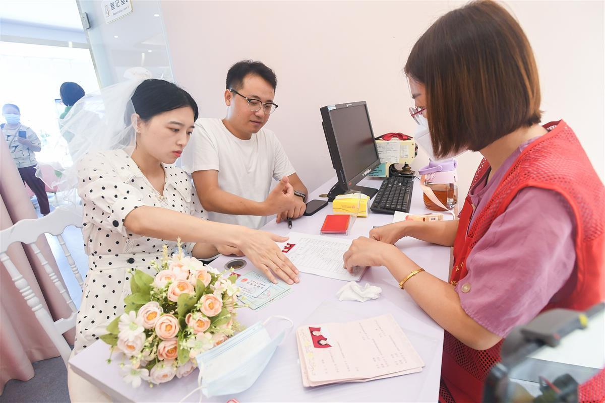 武汉市青山区民政局婚姻登记处青山江滩结婚登记点负责人韩忠新告诉记者,从2021年5月10日起,该处已为7000多对新人办理了结婚证,其中5000多对新人为跨区领证,198对新人为跨市领证,58对新人为跨省领证。韩忠新告诉记者,从2021年6月1日起,只要一方有武汉市户口或者一方有武汉市有效居住证,就可到武汉市任何一处婚姻登记处办理结婚证。据悉,8月4日当天,青山江滩结婚登记点共计为95对新人办理了结婚证。