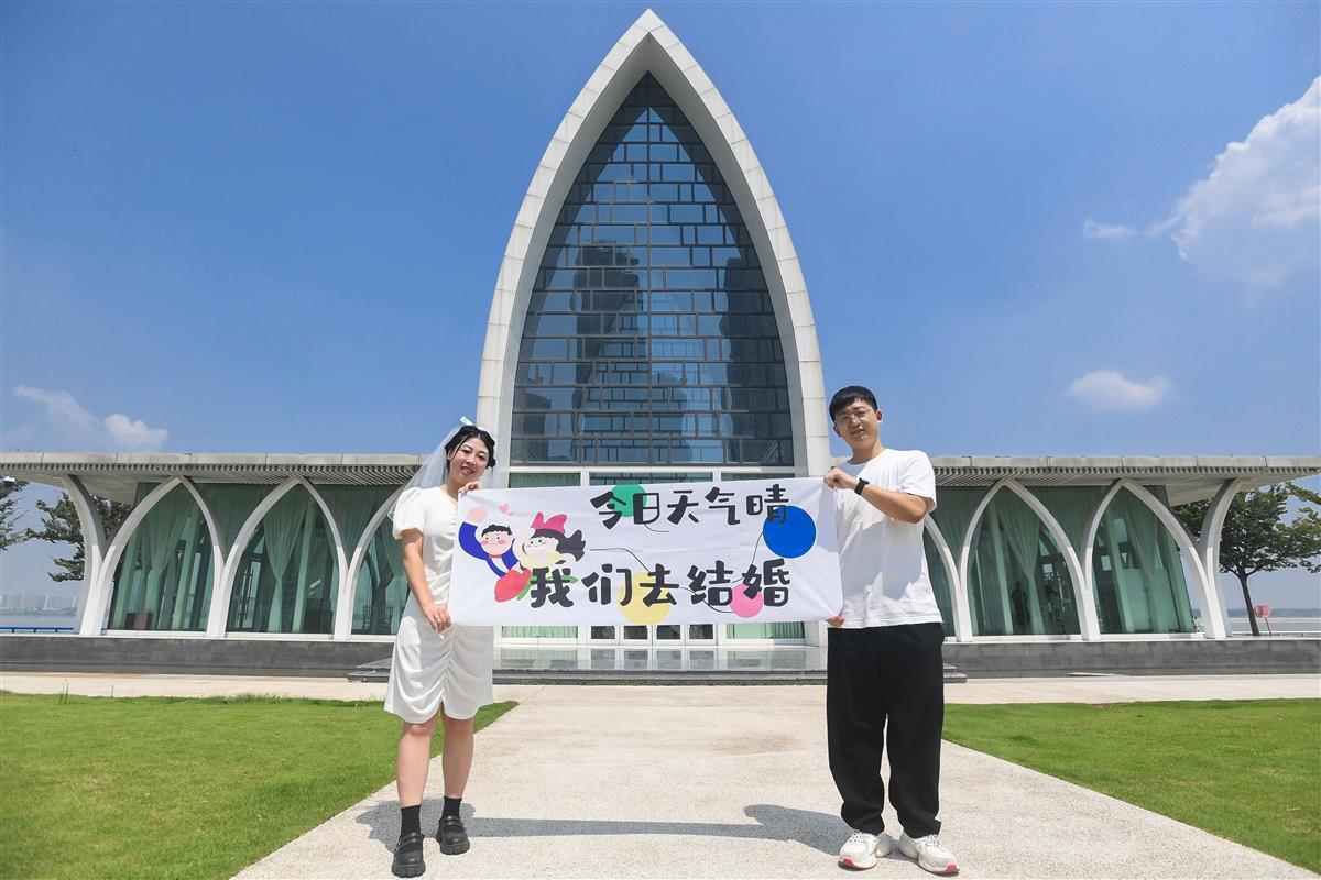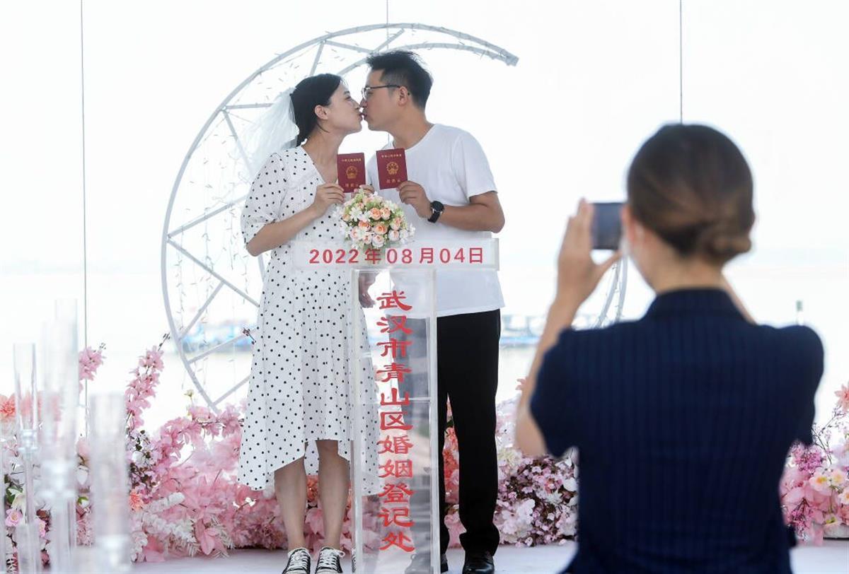 “今天天气晴,我们去结婚。”一对新人在武汉市青山区民政局婚姻登记处青山江滩结婚登记点领完证以后,拉起了横幅拍起了纪念照。8月4日是中国传统七夕节,不少情侣前往武汉青山江滩婚姻登记处登记结婚,当天共计95对新人办理结婚证。