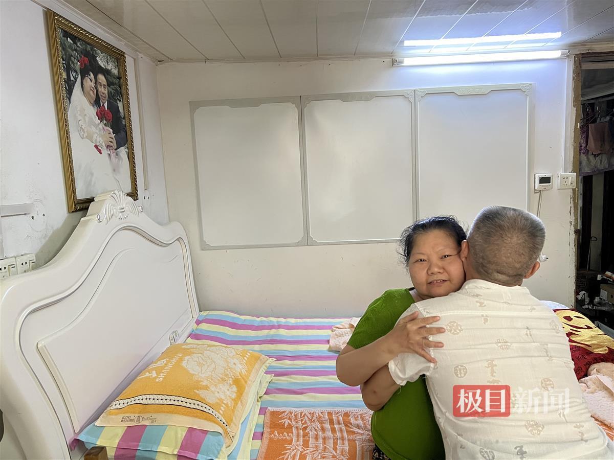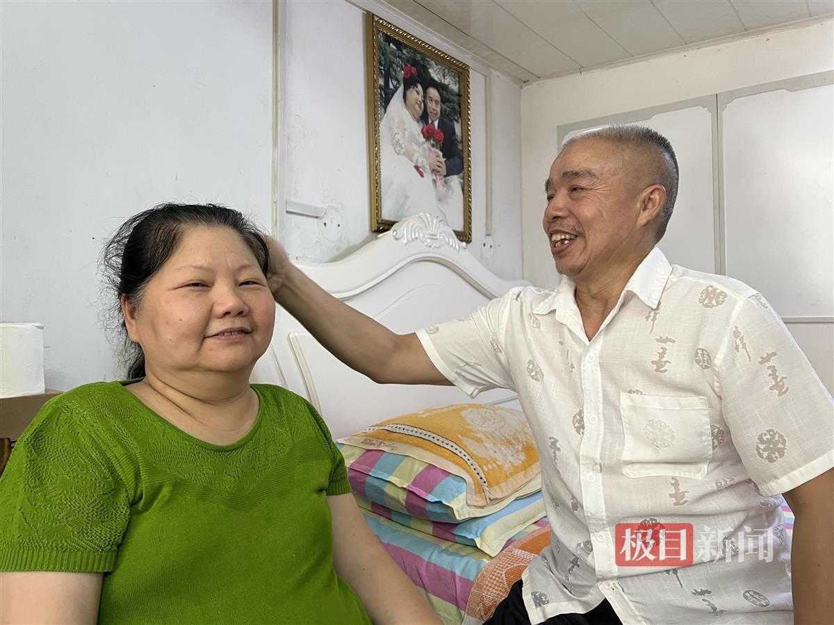 近日,极目新闻记者来到江汉区水塔街东民社区张新福和涂晚平家中,他们正和邻居们聊天说笑。记者看到,虽然房子只有20平米左右,但却干净整洁,十分温馨,屋里放着几把板凳和一张大床,床头挂着二人结婚时的照片。照片中,张新福穿着西装,涂晚萍穿着白色婚纱,手捧鲜花,依偎在张新福身旁,二人脸上都洋溢着幸福的笑容。