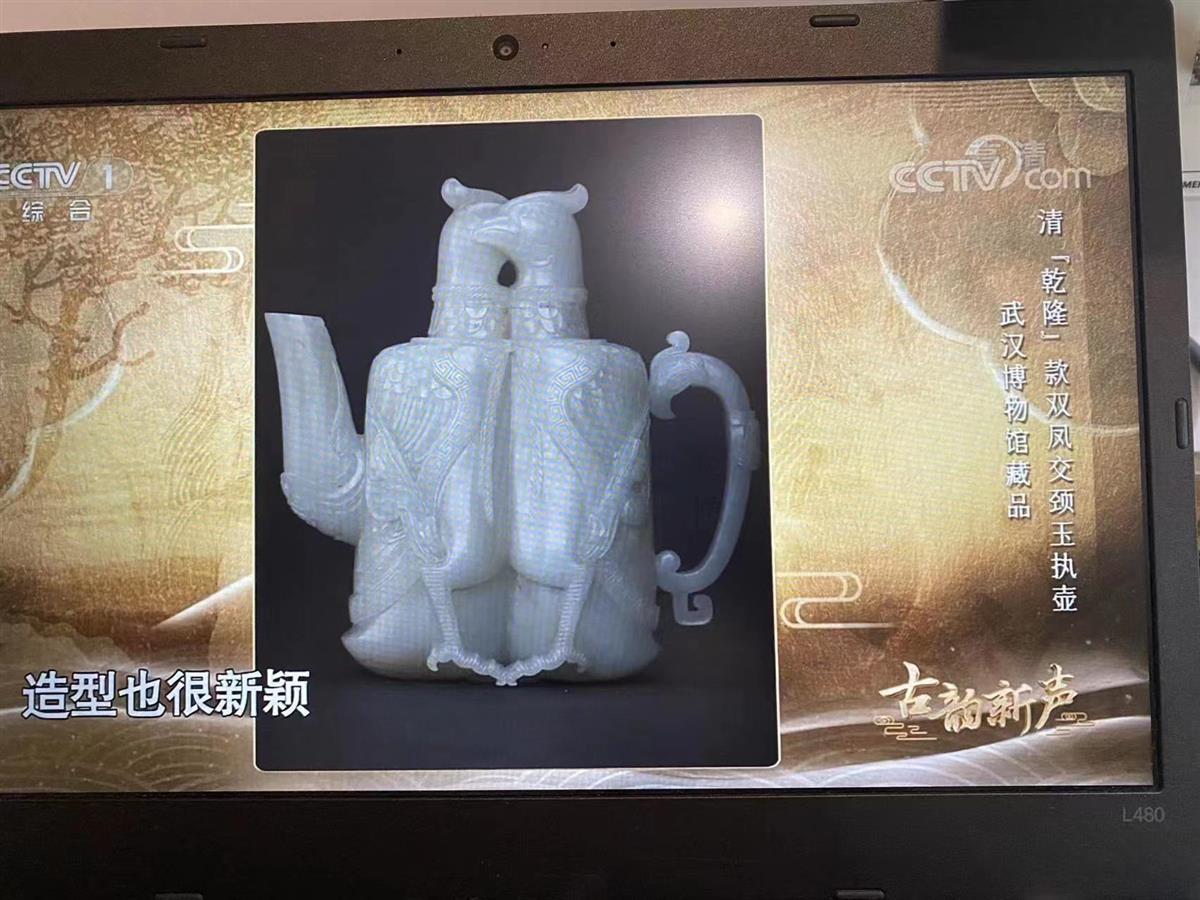 登上央视1套七夕晚会的这件清代“乾隆”款双凤交颈玉执壶,是武汉博物馆藏品,玉质洁白无瑕,造型新颖奇巧,琢磨精巧雅致,可谓是中国制玉工艺鼎盛时期的杰作。最吸引人注目的,应属玉壶构思奇特的造型:两只亲昵依偎的圆雕连体凤鸟构成壶身;紧贴两颊、交颈私语的凤首雕成壶盖;底部更是两足相抵、亲昵偎依。壶底铭有:“乾隆御制”填金篆书款,是宫中举行大婚之礼时所用的合卺之物。