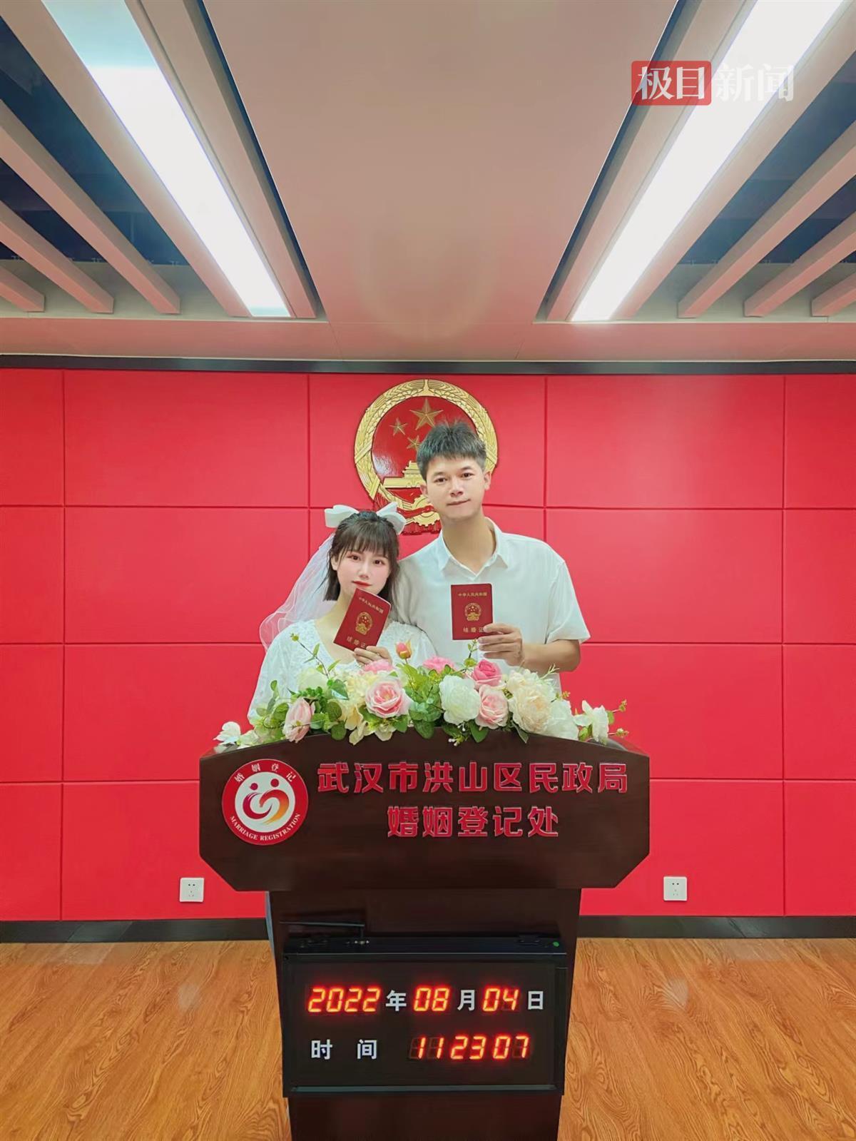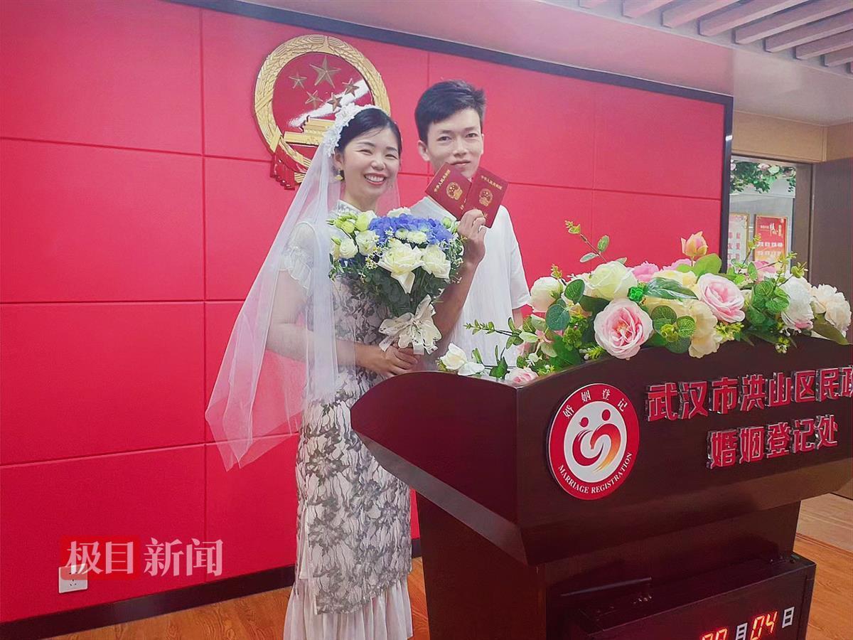 “我们都是孝感人,在亲戚的撮合下,最终选择和对方情定终生。”方瑶说,他们于2021年春节在湖北孝感老家举行婚礼,原本打算在今年5月20日领证,但因为当天结婚登记处人满为患,加上工作太忙,只好作罢。他们在七夕佳节再次来到民政局,仪式感满满地领取了属于自己的“红本本”。