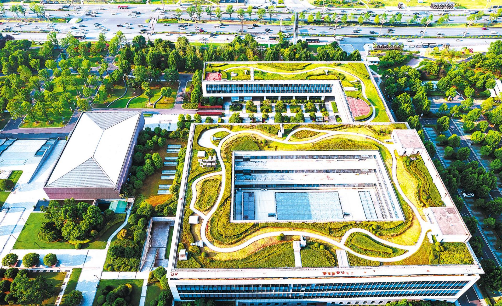 8月4日,鸟瞰近期建成开放的武汉东湖高新区政务中心“空中花园”。 政务中心大楼与比邻的办公大楼楼顶,已被建成了一座绿意盎然的“空中花园”。花园错落有致地种植50余种花卉与植物,配备了休闲长椅、健身步道。据了解,随着城市化进程的加快,武汉积极探索绿化新模式,引导有条件的单位场所进行屋顶绿化,对一些主要公共建筑和政府机关单位开展楼顶绿化建设,并取得一定的成效。