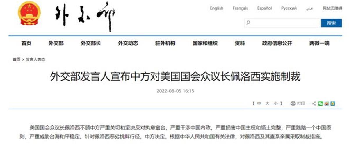 据外交部官网消息,美国国会众议长佩洛西不顾中方严重关切和坚决反对执意窜台,严重干涉中国内政,严重损害中国主权和领土完整,严重践踏一个中国原则,严重威胁台海和平稳定。针对佩洛西恶劣挑衅行径,中方决定,根据中华人民共和国有关法律,对佩洛西及其直系亲属采取制裁措施。
