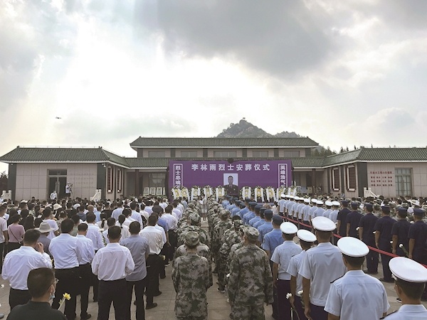 上午9时30分许,安葬仪式开始,两名军人托着李林雨的遗像和棺椁缓缓前行。全体人员脱帽肃立,向烈士默哀。