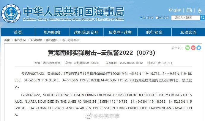 连云港海事局发布航行警告,8月6日至8月15日每日8时至18时,在黄海南部部分海域进行实弹射击,禁止驶入。
