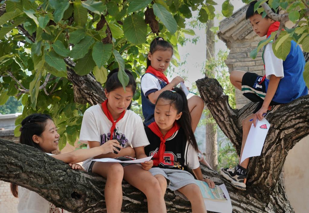 在村儿童游乐场旁的核桃树下,10岁的张皓峰正在读刚写的一首小诗。自从大南坡村小学开了诗歌课,张皓峰就爱上了写诗。为了更好地开展儿童美育,学校还依托村里文化和设计团队,开设绘本、美术、草木染等课程。如今,这个只有50名学生的乡村小学已经出了两本诗歌集和7本绘本。