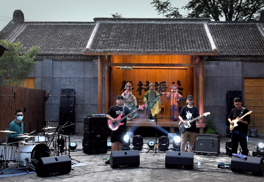 怀梆剧团和摇滚乐队在大南坡村表演。新华社记者 李安 摄