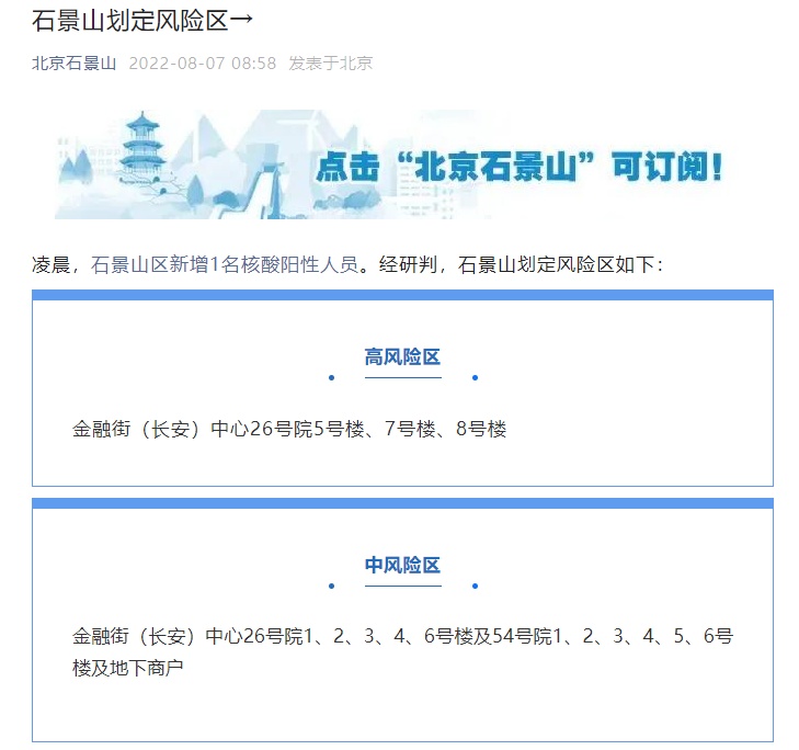 凌晨,北京市石景山区新增1名核酸阳性人员。经研判,石景山划定风险区如下:
