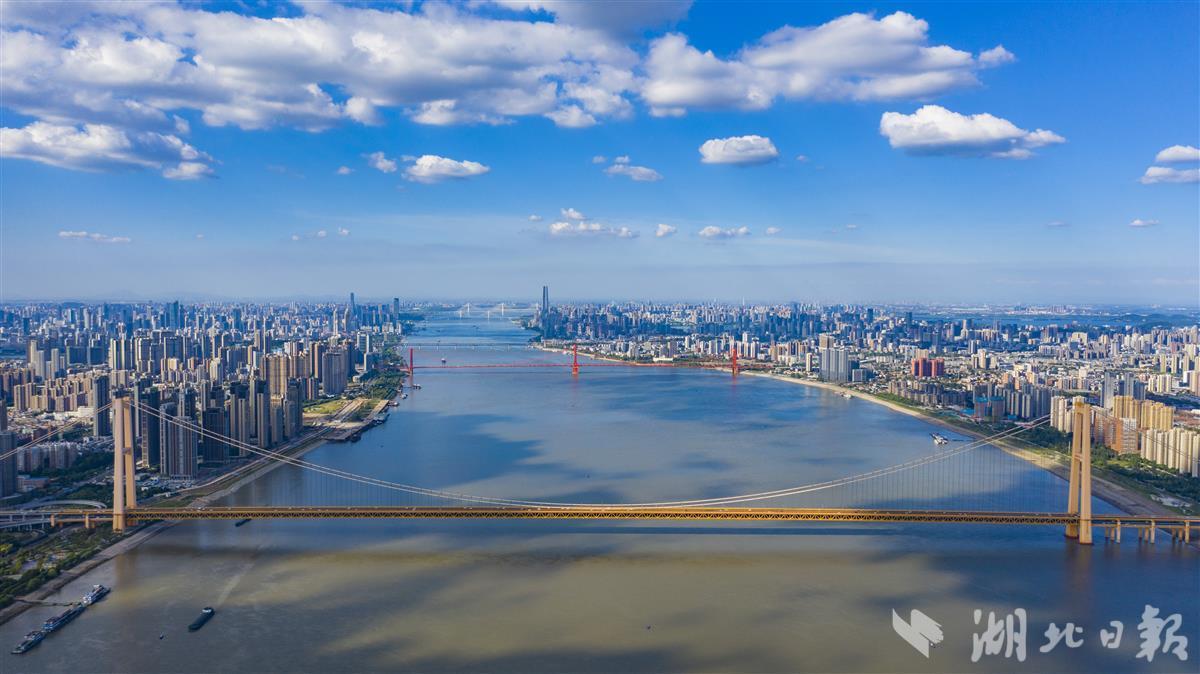 8月5日,受副热带高压影响,武汉天气持续晴好,风轻云淡,鸟瞰长江武汉段,7座跨江大桥尽收眼底。(由近到远为:杨泗港长江大桥、鹦鹉洲长江大桥、武汉长江大桥、武汉长江二桥、二七长江大桥、天兴洲长江大桥、青山长江大桥)气象部门预计未来数天,全省大部持续晴热高温天气为主,局部高温将达40℃以上,提醒公众注意防暑降温,及时补充水分,以防中暑。