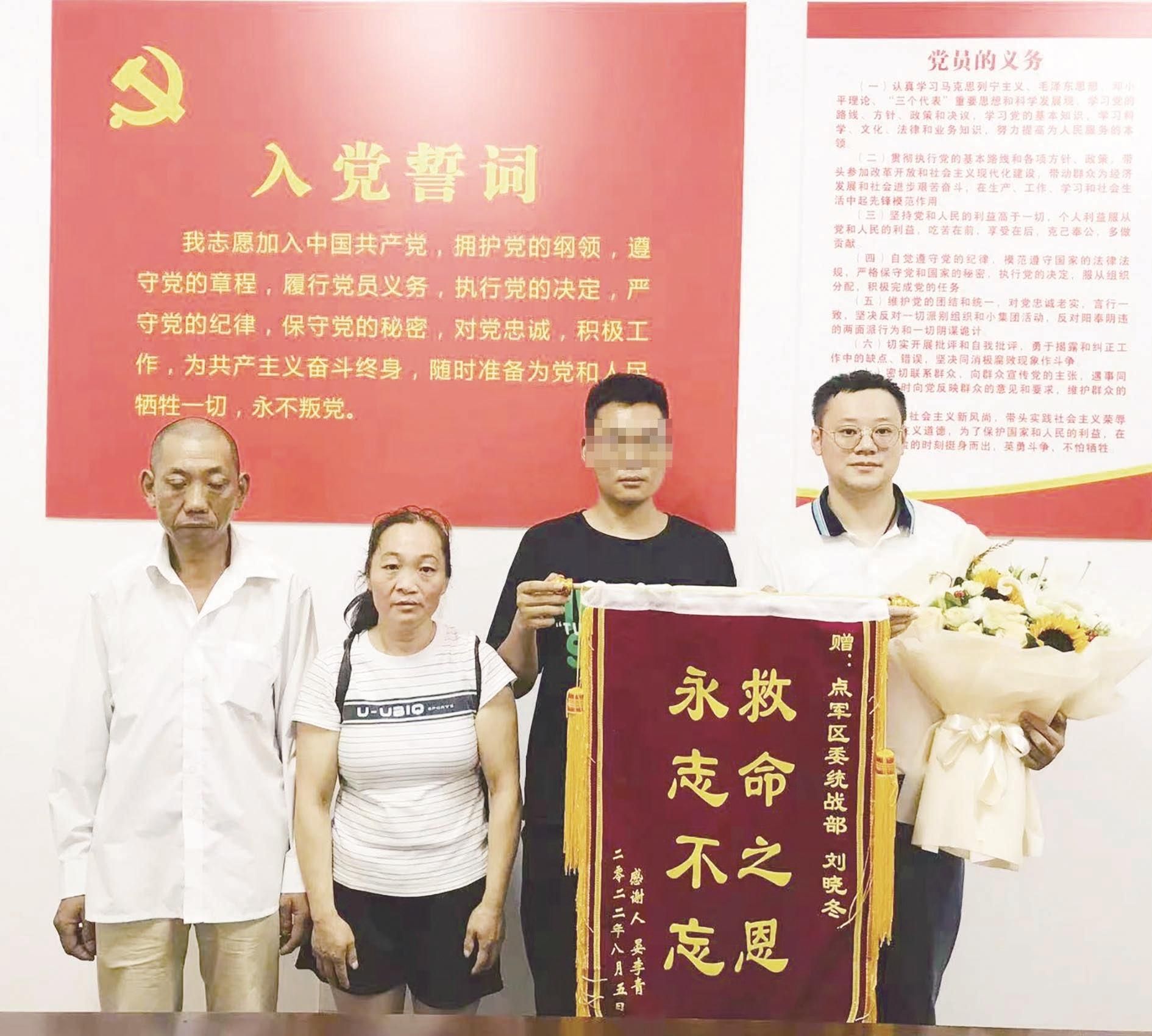 获救溺水青年一家人给刘晓冬(右一)送来锦旗和鲜花,感谢他在危急时刻挺身而出。