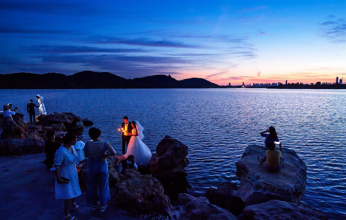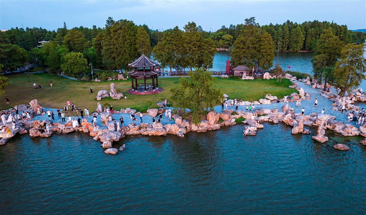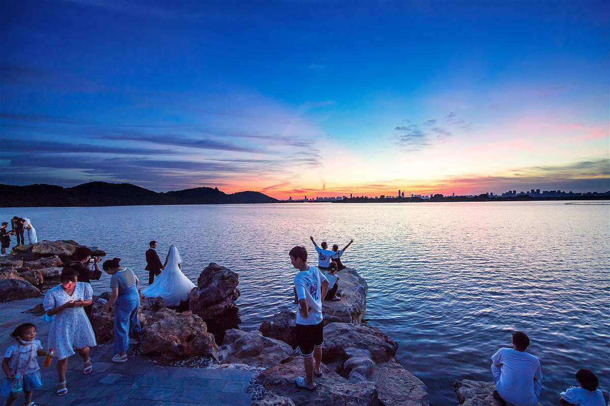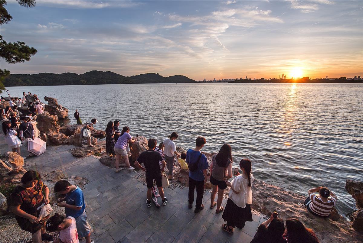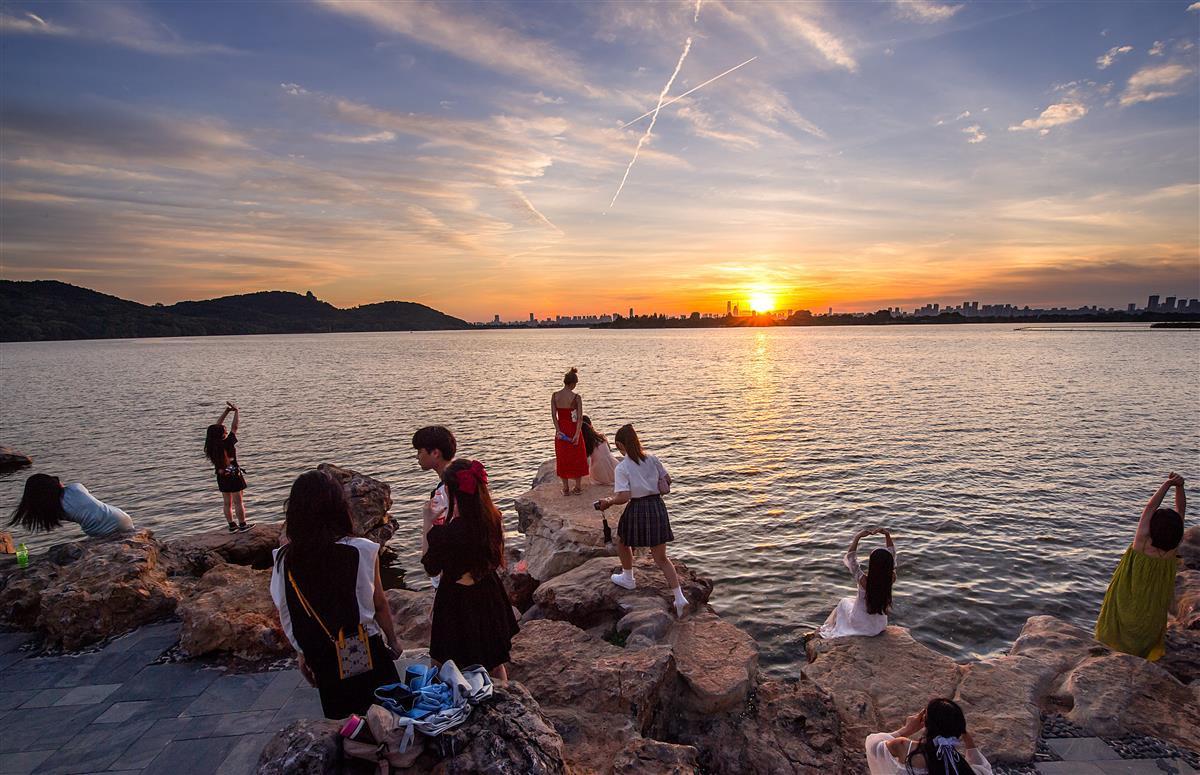 8月7日,夕阳西下时,武汉东湖落雁景区芦洲古渡湖岸边,新添的“叠石观涛”景点,叠石形态各异,像海边的樵石,众多游人站在石上静静等一场金色日落,徐徐清风,夕阳余晖照映湖面,画面颇为壮观。