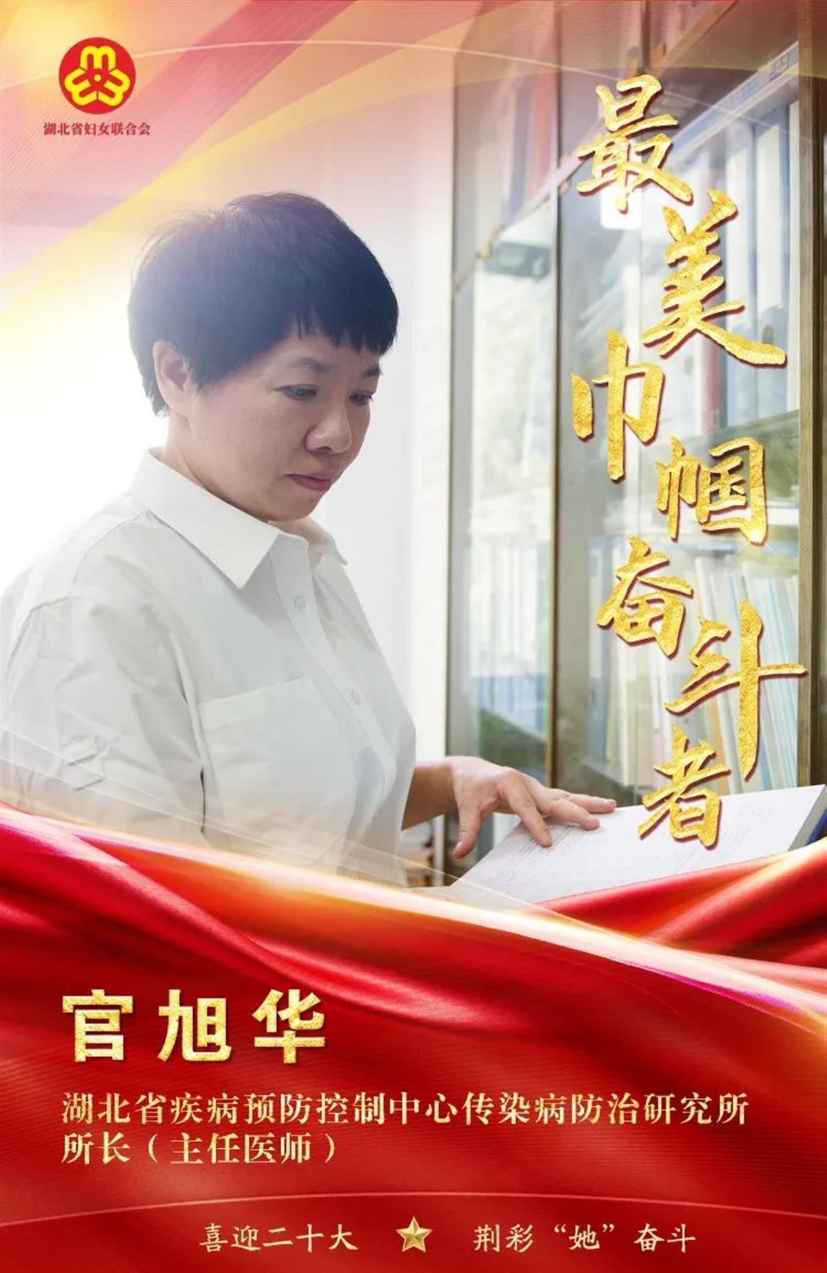 作为湖北省疾控中心新冠肺炎疫情防控一线的女指挥长,2019年12月底,官旭华第一时间带队赶赴华南海鲜市场和隔离病房,调查清楚早期聚集性病例的传播链、暴露史等,为病原确认和疫情研判,提供了详细准确的流调信息;2020年1月中旬,她通过监测与调查、准确判断和及时预警了武汉市之外的新冠社区流行,为国家防控策略转变提供关键依据;1月底在全国疾控中心和全省地市疾控中心视频会商会上,她第一时间发出专业预警“新冠社区传播静悄悄”,为全国和全省节约了宝贵的防控窗口期时间。疫情期间,官旭华率队先后完成了多起暴发疫情控制、感染谱调查、医务人员感染调查、全省死亡分析、全省风险评估、血清学流调等多项关键任务,高效促进了湖北省疫情的防控工作,并先后支援黑龙江省、福建省等,为控制全国疫情做出了贡献。