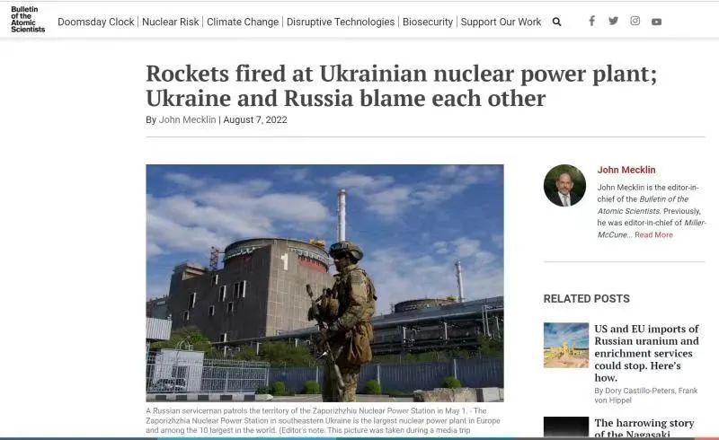 《原子科学家公报》关于扎波罗热核电站遭遇炮击的报道。图/《原子科学家公报》官方网站