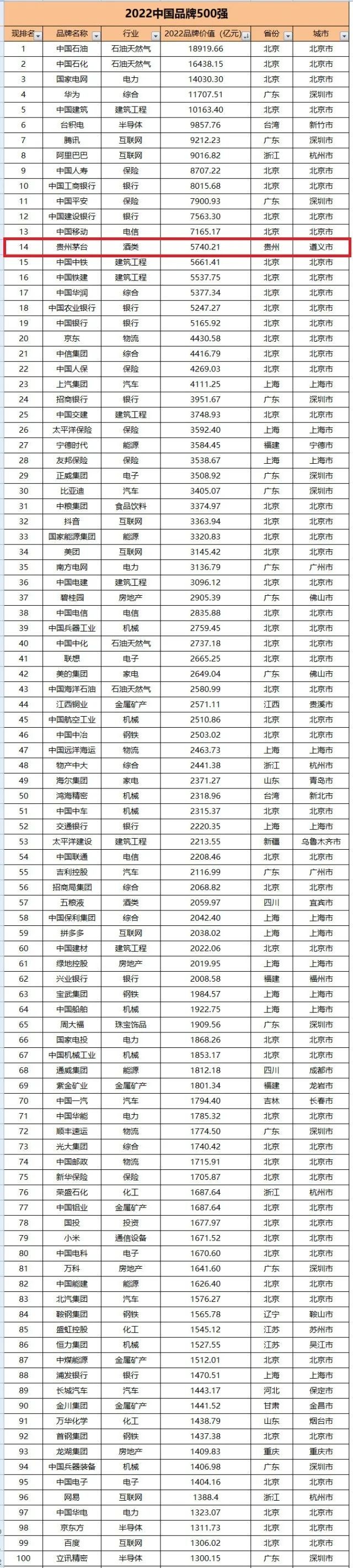 茅台品牌价值再获认可。8月8日,由品牌联盟、中国会展经济研究会联合主办的2022中国品牌节第16届年会在湖南长沙召开,2022中国品牌500强、2022世界品牌500强揭晓,茅台以5740.21亿元的品牌价值位于中国品牌第14位,在世界品牌500强中排名第64位。