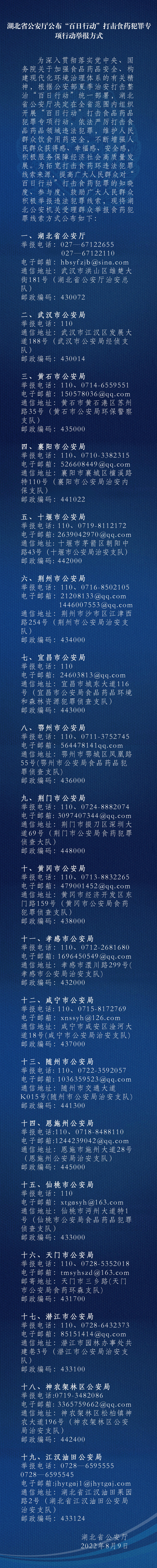 为拓宽打击食药环违法犯罪线索来源,提高广大人民群众对“百日行动”打击食药犯罪的知晓度、参与度,鼓励广大人民群众积极举报违法犯罪线索,现将湖北公安机关受理群众举报食药犯罪线索方式公布如下: