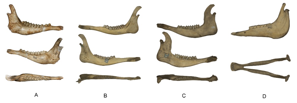 肿骨中华大角鹿(A),驼鹿(B),水牛(C)和家马(D)的下颌骨。(中科院古脊椎所供图)