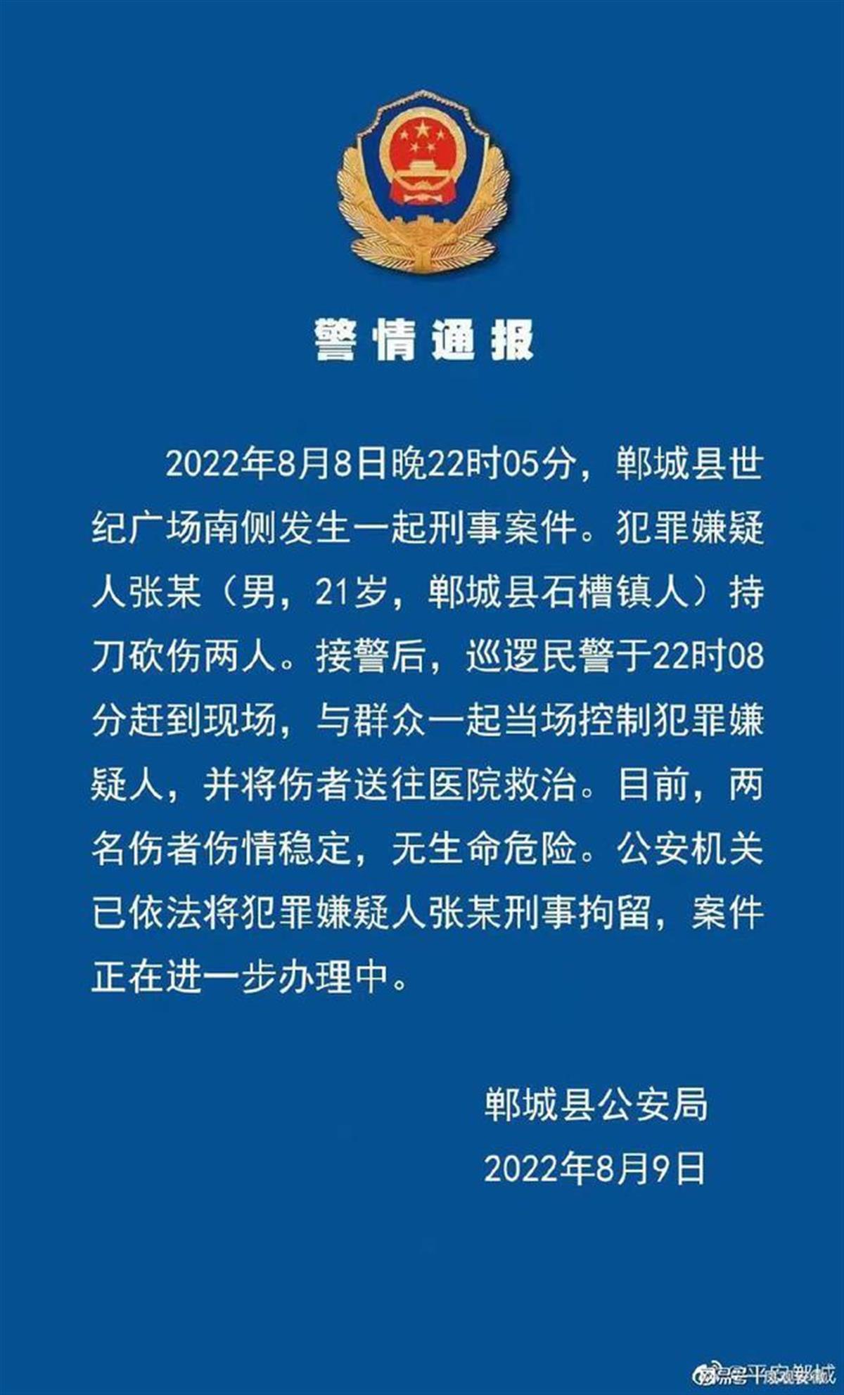 据郸城县公安局9日发布的警情通报,8日晚10时05分,郸城县世纪广场南侧发生一起刑事案件。犯罪嫌疑人张某(男,21岁,郸城县石槽镇人)持刀砍伤两人。接警后,巡逻民警于晚10时08分赶到现场,与群众一起当场控制犯罪嫌疑人,并将伤者送往医院救治。