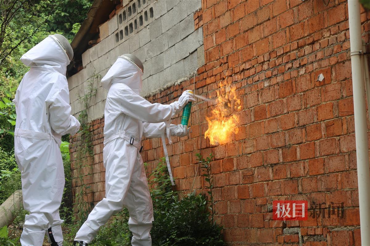 在现场确定情况后,消防救援人员一边劝导周边群众回到屋内,关好门窗,一边穿着防蜂服,利用撬棍将墙砖撬开,采取火攻的方式,成功蜂窝摘除。消防救援人员还在蜂窝处喷洒除蜂药剂,避免马蜂二次筑巢。由于天气炎热,温度较高,脱下防蜂服的那一刻,作业消防员全身湿透。