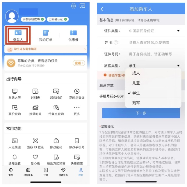②通过铁路12306网站、App购买学生票,在添加乘车人时将旅客类型选为“学生”。