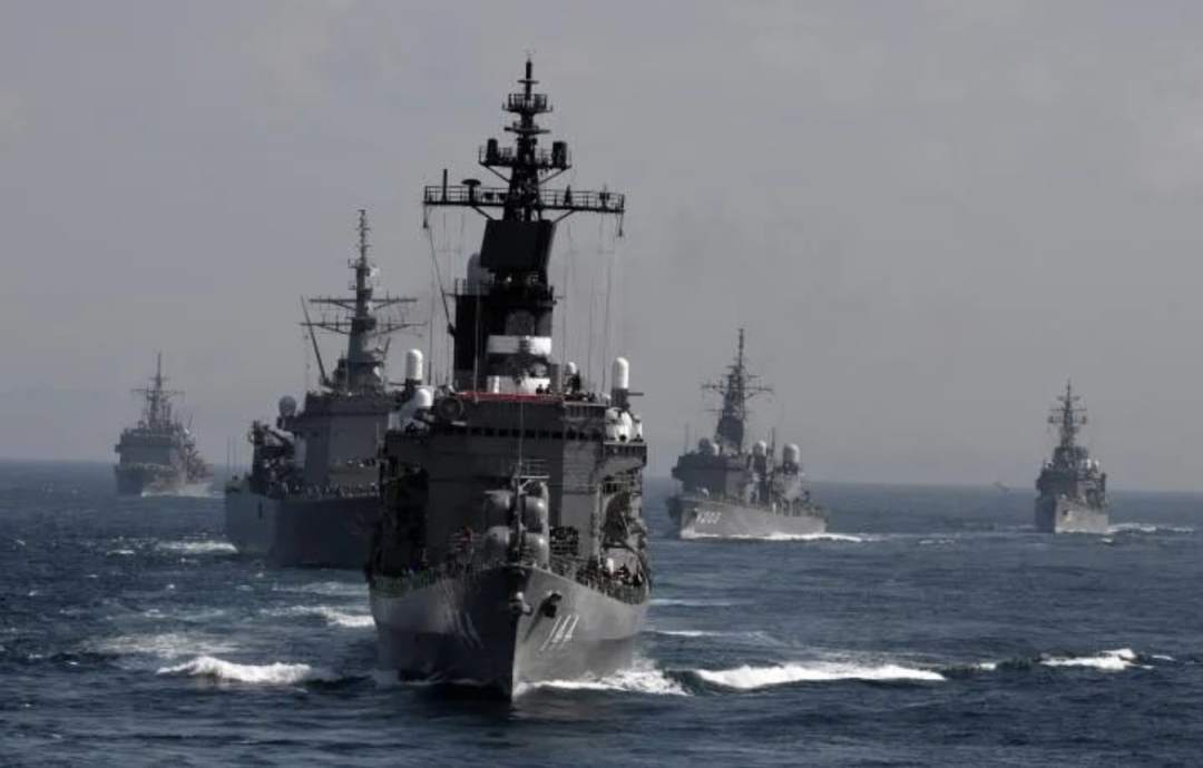 2015年10月18日,在日本神奈川县的相模湾,日本海上自卫队舰只编队航行。新华社记者 马平 摄