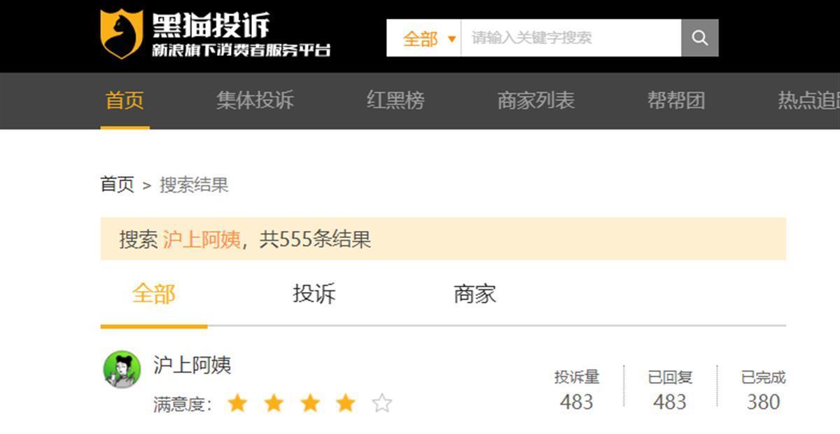 12日,在黑猫投诉平台上,极目新闻记者以“沪上阿姨”为关键词搜索,相关结果多达500余条,投诉量483件。