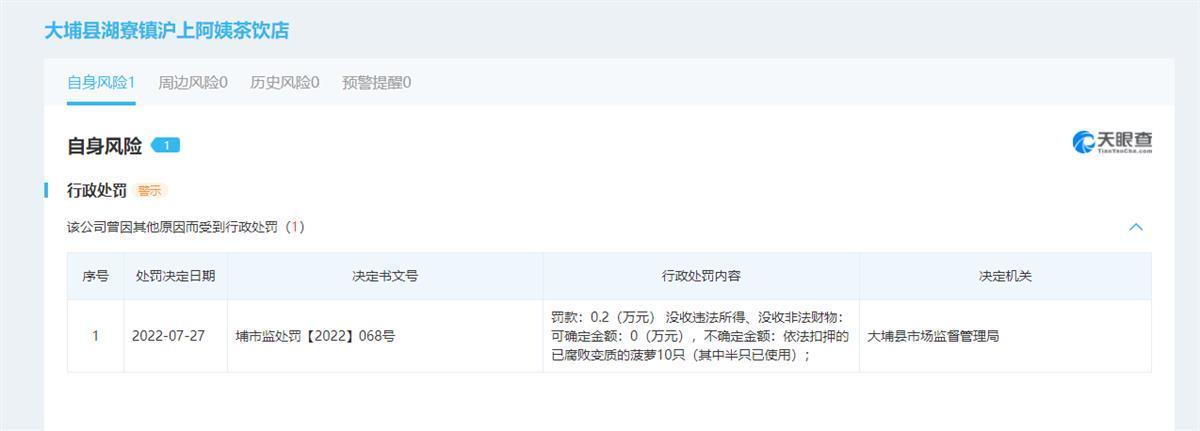近日,广东省大埔县一“沪上阿姨”茶饮店因经营腐败变质、感官性状异常的食品,被广东省梅州市大埔县市场监督管理局罚款2000元。据悉,至执法人员检查时,该批鲜菠萝从感官上已明显腐烂、变质,且当事人已使用半只鲜菠萝用于制作6杯百香果金菠萝水果茶,并已全部销售。8月12日,极目新闻记者梳理发现,该品牌旗下门店曾多次被市场监管部门处罚,涉及食品安全等方面问题。