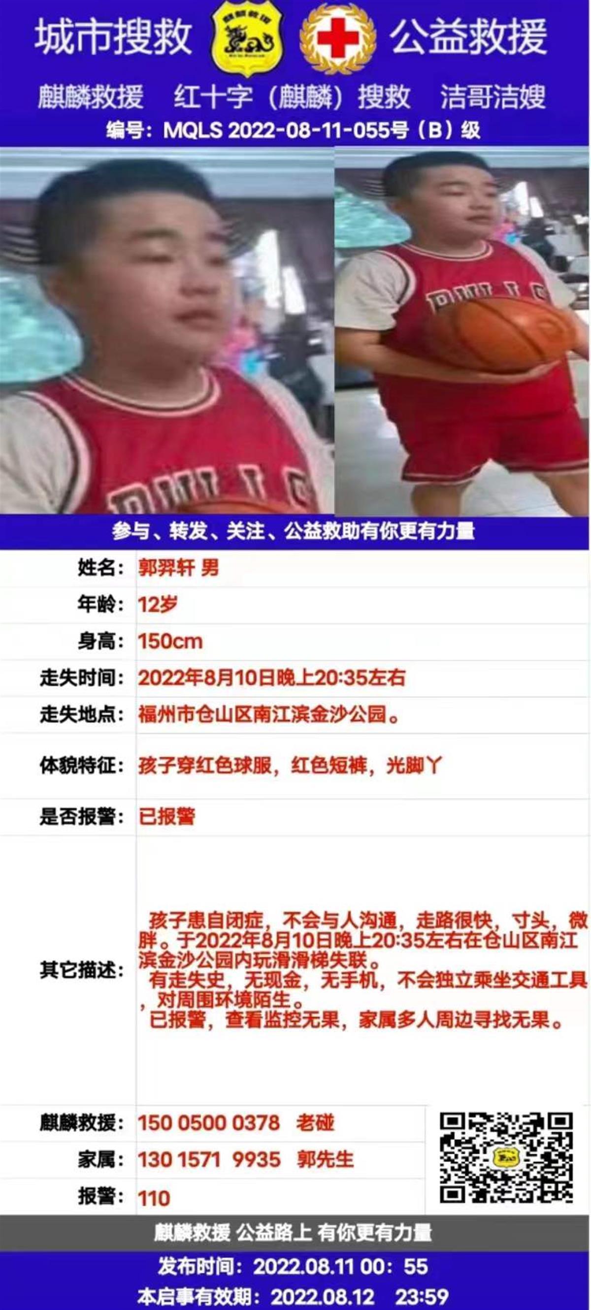 戴女士发布的寻人启事显示,12岁的郭羿轩于8月10日晚8时30许在福州仓山区金沙公园走失,他身高1.5米,身穿红色篮球服和短裤,光脚。