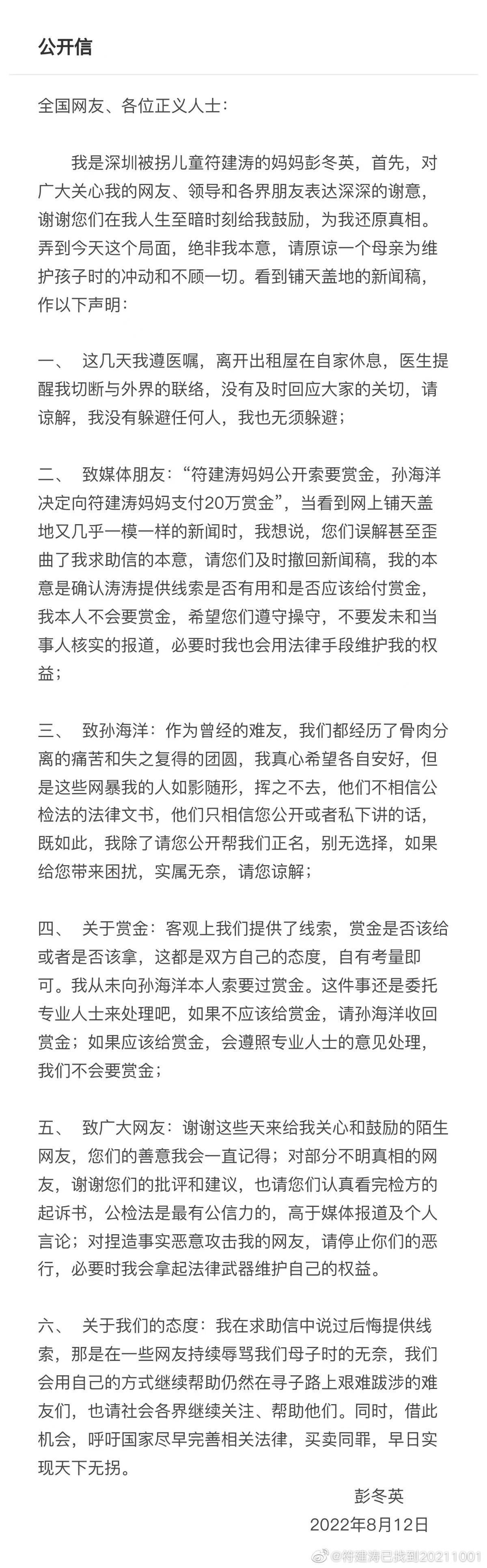 12日下午,彭冬英在其社交账号发布公开声明,并特意艾特了孙海洋以及极目新闻等媒体。彭冬英表示,她此前发文本意是确认儿子提供的线索是否有用,以及是否应该给付赏金,网友们误解了她的本意。“我从未向孙海洋本人索要过赏金。”她还说,客观上他们提供了线索,不管赏金该不该拿,她都不会要赏金。另外,她还提到,希望网友们能停止对她的恶意攻击。