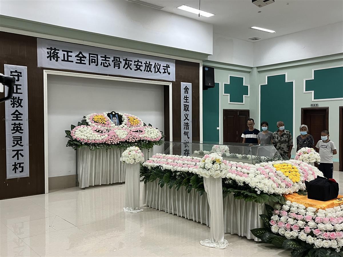 蒋正全的骨灰进入殡仪馆后,放在殡仪馆中央放置,四周布置着白色、黄色的菊花。边上写着挽联:“守正救全英灵不朽,舍生取义浩气长存。”全体人员鞠躬向英雄致敬,并默哀三分钟。