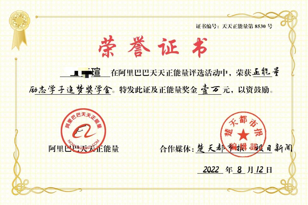 8月12日,了解到小瑄的情况后,阿里公益天天正能量联合极目新闻,为王梦瑄颁发万元正能量励志学子追梦奖学金,助力女孩逆风飞翔!也愿这份爱心,能点燃世间万千善意,希望女孩能获得更多关注和助力。