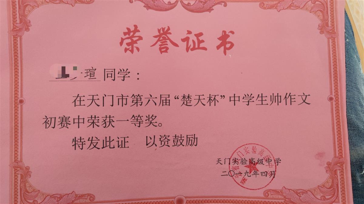 “提前做做大学的题,免得到了大学跟不上。”小瑄说。父亲王玛介绍,女儿从小就爱学习,从来不出去玩,回来就是看书做题,而她的成绩也一直都很好,“特别是语文,这次高考总分考了540多分,语文考了135分。”王玛珍藏着女儿一堆荣誉证书,其中有天门市第六届“楚天杯”中学生帅作文大赛初赛一等奖,第十七届“楚天杯”帅作文大赛(天门赛区)决赛高中组三等奖。