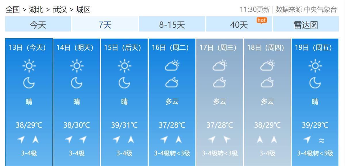记者统计发现,自8月7日以来,武汉中心气象台已经连续7天发布高温红色预警信号。12日,湖北竹山高温达44.3℃,刷新有气象记录以来我省最高气温纪录。13日,高温依然不休,中午12时全省大部地区高温已登场,一半地区气温已达37℃以上,保康、兴山、宜都、黄石、大冶已经超过39℃。