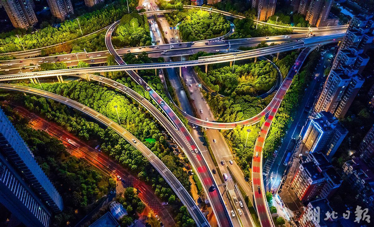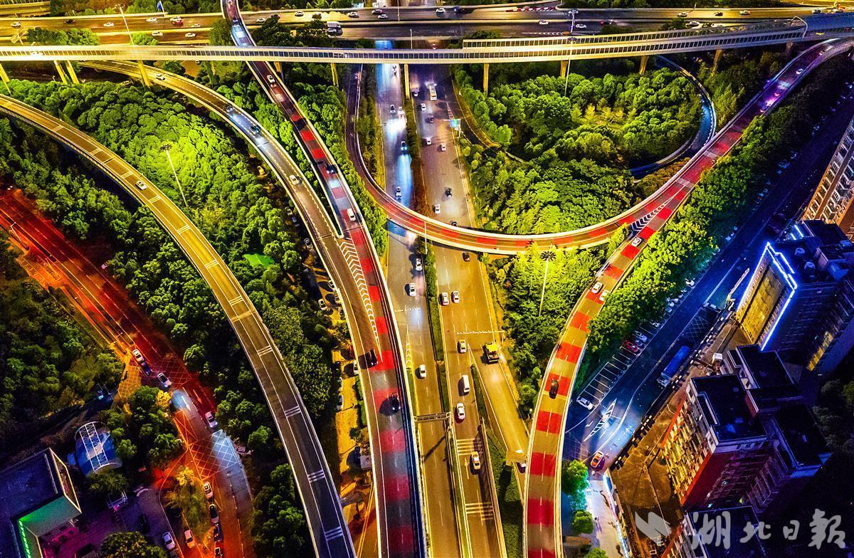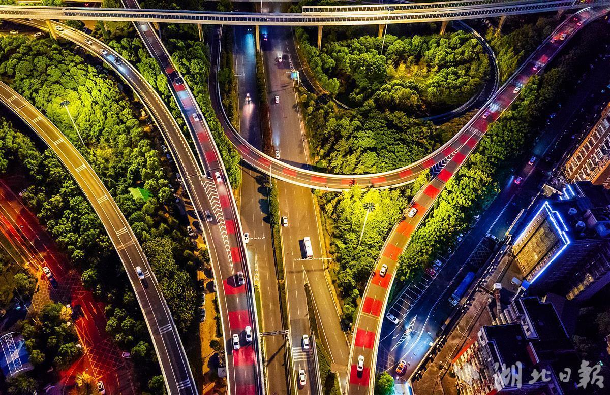 8月13日晚,鸟瞰“变色”的武汉红庙立交桥。该立交,3条立交桥匝道铺上了红色、灰色相间的塑胶,如天际中的彩虹,色彩绚丽,场面壮观。