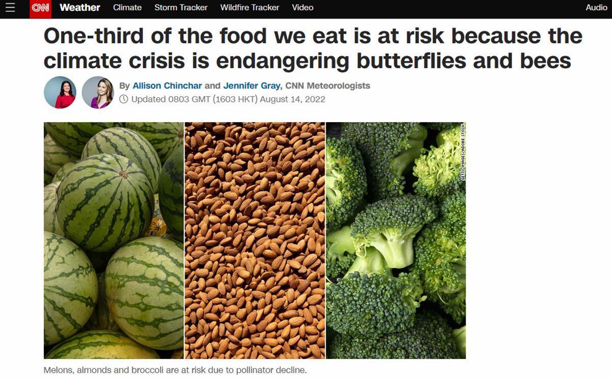 人类食物中约有三分之一需要依靠蜜蜂、蝴蝶等其他授粉动物。但由于气候危机,这些动物正处于危险之中。据CNN14日报道,包括蜜蜂、蝙蝠和帝王蝶在内的授粉动物的数量正急剧下降,对全球农作物产量产生影响。