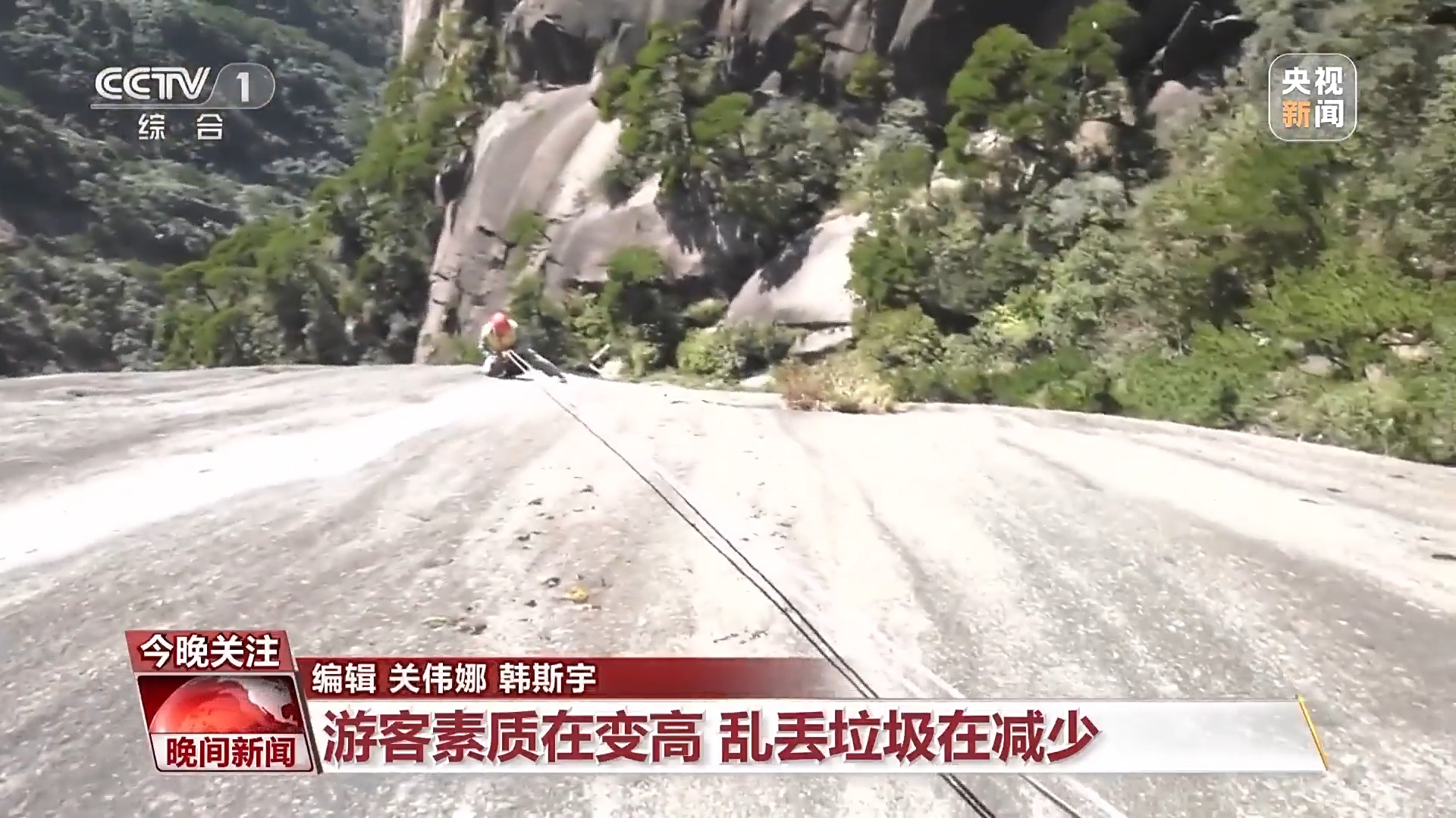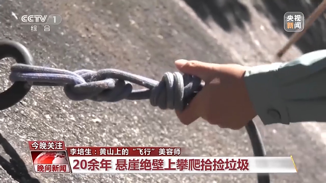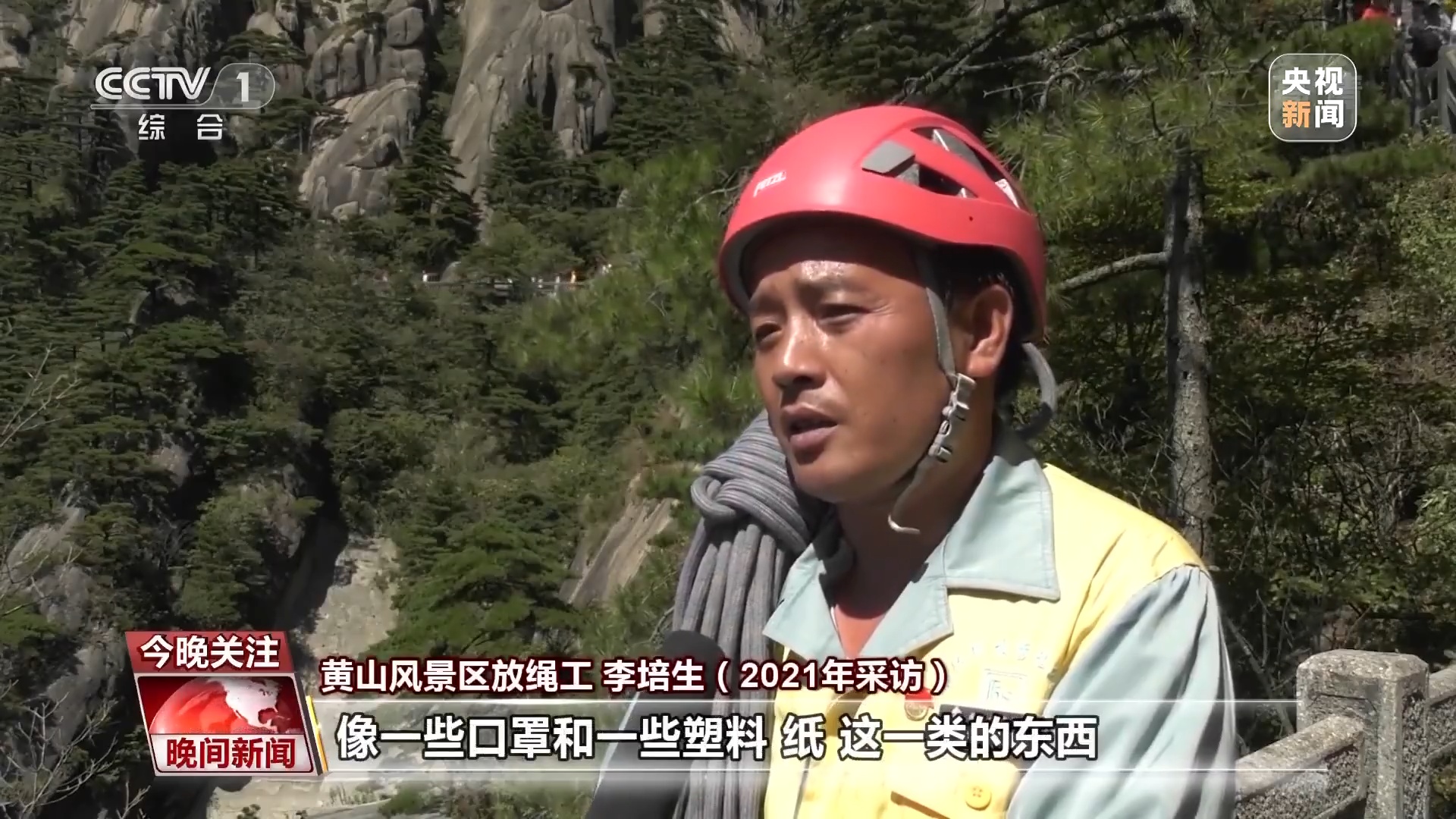 黄山风景区放绳工 李培生:现在游客的文明程度高了,丢弃垃圾的现象少了,我们主要是捡拾一些被风刮到悬崖下的垃圾,像一些口罩、塑料纸等。