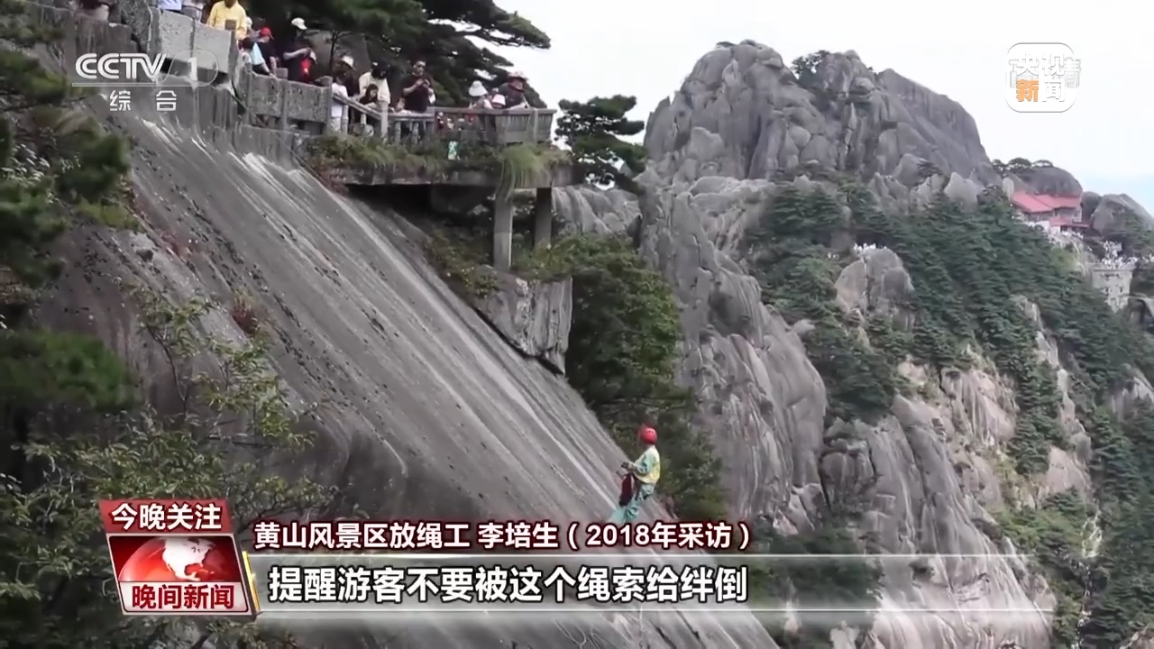 黄山风景区放绳工 李培生:我们放这个绳索,一组是两个人。我的同伴在上面主要负责帮我看这个绳头,提醒游客不要被这个绳索给绊倒,我在下面看的视线比较小,他在上面看的视线比较大,他告诉我垃圾在什么方位,我捡起来会比较轻松,也比较节省时间。
