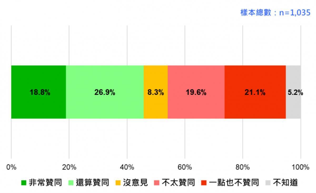 据台媒报道,民调显示,对于“一般说来,您赞同或不赞同蔡英文处理台湾大事的方式,包括重要人事安排与政策?”这一问题,21.1%的台湾民众“一点也不赞同”蔡英文处理台湾事务的方式,19.6%的台湾民众“不太赞同”,26.9%“还算赞同”,18.8%“非常赞同”,另有13.5%没意见、不知道或拒答。