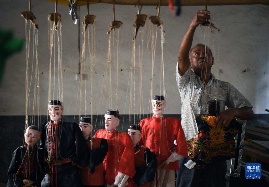 在江西省广昌县塘坊镇大株村,木偶剧团团长谢帮银(右)和同事一起表演木偶戏(8月10日摄)。